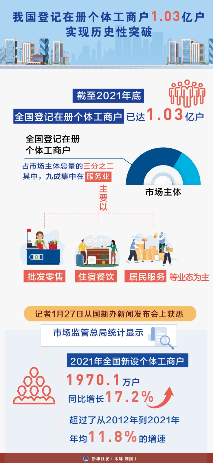 我國登記在冊個體工商戶邁上1億戶臺階,實現(xiàn)歷史性突破。截至2021年底,全國登記在冊個體工商戶已達(dá)1.03億戶,占市場主體總量的三分之二。其中,九成集中在服務(wù)業(yè),主要以批發(fā)零售、住宿餐飲和居民服務(wù)等業(yè)態(tài)為主。