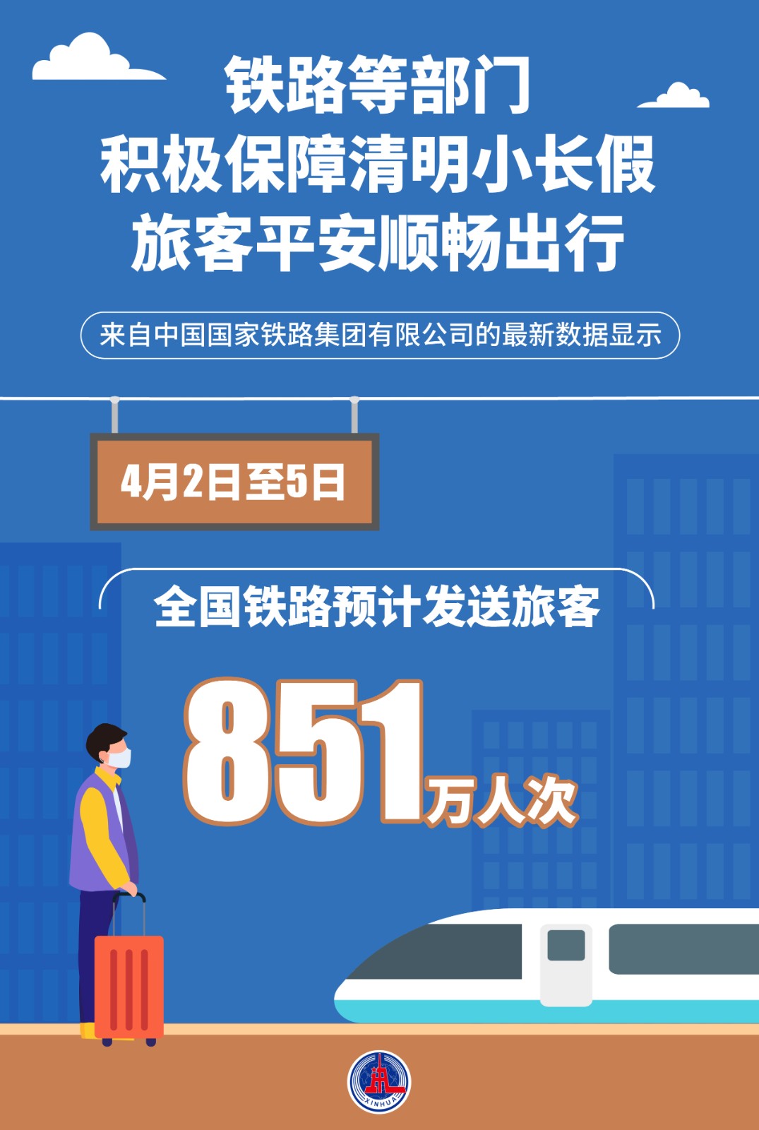 全國鐵路清明假期運輸期限為4月2日至5日共4天。來自中國國家鐵路集團有限公司的最新數(shù)據(jù)顯示,2日至5日,全國鐵路預(yù)計發(fā)送旅客851萬人次,鐵路運輸平穩(wěn)有序。