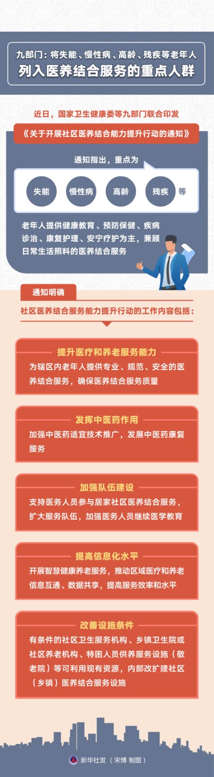 醫(yī)養(yǎng)結合是實現(xiàn)健康老齡化、滿足老年人健康養(yǎng)老服務需求的重要舉措。近日,國家衛(wèi)生健康委等九部門聯(lián)合印發(fā)《關于開展社區(qū)醫(yī)養(yǎng)結合能力提升行動的通知》。通知指出,重點為失能、慢性病、高齡、殘疾等老年人提供健康教育、預防保健、疾病診治、康復護理、安寧療護為主,兼顧日常生活照料的醫(yī)養(yǎng)結合服務。