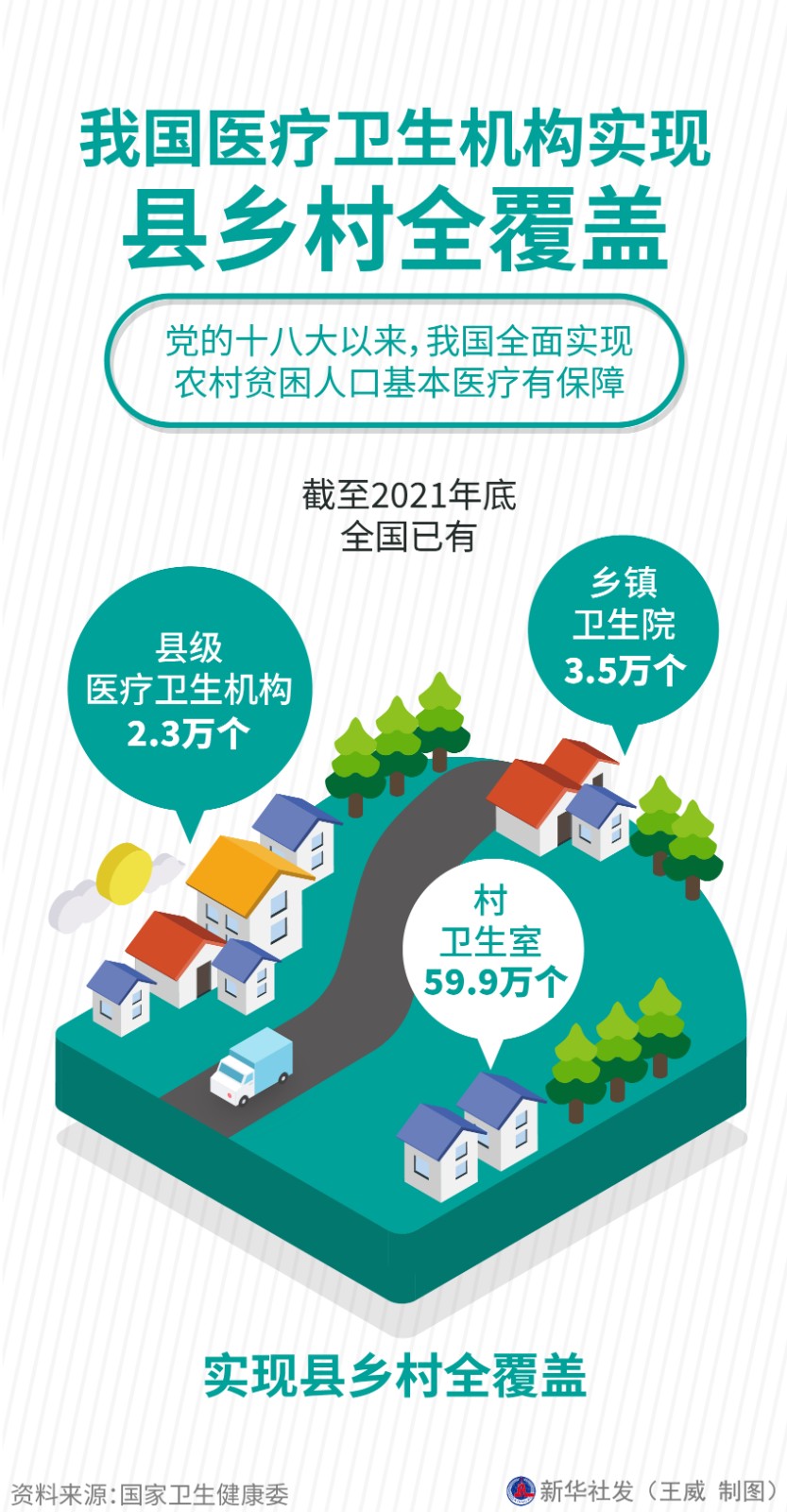 黨的十八大以來(lái),我國(guó)全面實(shí)現(xiàn)農(nóng)村貧困人口基本醫(yī)療有保障。截至2021年底,全國(guó)已有縣級(jí)醫(yī)療衛(wèi)生機(jī)構(gòu)2.3萬(wàn)個(gè),鄉(xiāng)鎮(zhèn)衛(wèi)生院3.5萬(wàn)個(gè),村衛(wèi)生室59.9萬(wàn)個(gè),實(shí)現(xiàn)縣鄉(xiāng)村全覆蓋。