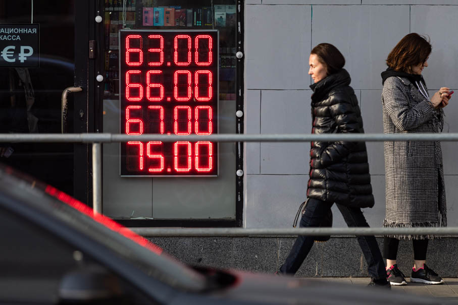 5月24日,在俄羅斯首都莫斯科,行人經(jīng)過一家外匯兌換點。
