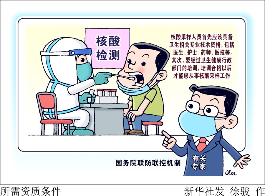 國(guó)家衛(wèi)生健康委醫(yī)政醫(yī)管局監(jiān)察專員郭燕紅介紹,核酸采樣人員首先應(yīng)該具備衛(wèi)生相關(guān)專業(yè)技術(shù)資格,包括醫(yī)生、護(hù)士、藥師、醫(yī)技等。其次,要經(jīng)過衛(wèi)生健康行政部門的培訓(xùn),培訓(xùn)合格以后才能夠從事核酸采樣工作。