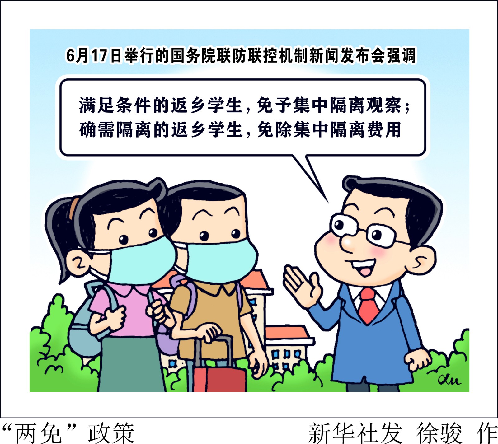 暑期即將來臨,新冠肺炎疫情下如何保證高校學(xué)生順利返鄉(xiāng)?6月17日舉行的國務(wù)院聯(lián)防聯(lián)控機(jī)制新聞發(fā)布會強(qiáng)調(diào),滿足條件的返鄉(xiāng)學(xué)生免予集中隔離觀察,確需隔離的返鄉(xiāng)學(xué)生免除集中隔離費(fèi)用;各地要逐級傳達(dá)、落實學(xué)生離校返鄉(xiāng)政策,不得層層加碼。