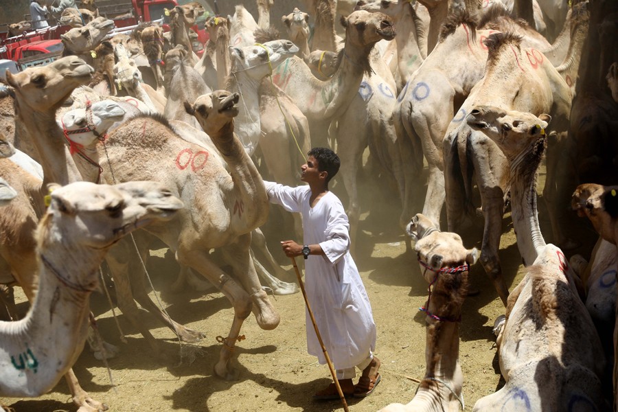 6月10日,商販在埃及開羅附近的一處駱駝市場(chǎng)等待顧客。