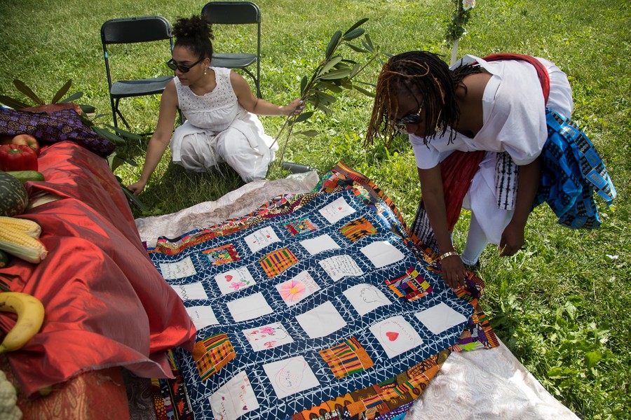 6月19日是美國的六月節(jié),也是紀(jì)念和慶祝美國黑人奴隸獲得解放的日子。在紐約展望公園六月節(jié)慶?;顒?dòng)現(xiàn)場的一個(gè)臨時(shí)帳篷里,一場悼念新冠逝者的拼布活動(dòng),氣氛肅穆,與周圍歡樂的氣氛顯得有些格格不入。拼布作品由許多小方塊織物縫合而成,每塊織物代表了活動(dòng)參加者對死于新冠的親人的思念和追憶?;顒?dòng)組織方鼓勵(lì)更多人帶來逝去親人曾穿過衣物的布片,以便縫制一塊更大的拼布。