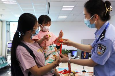 圖為6月3日,燈塔市公安局窗口服務(wù)大隊(duì)民警為前來辦理業(yè)務(wù)的群眾贈送平安小禮物。