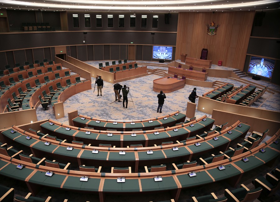 這是位于津巴布韋漢普登山新城的新議會大廈內(nèi)的參議院議事廳(6月29日攝)。