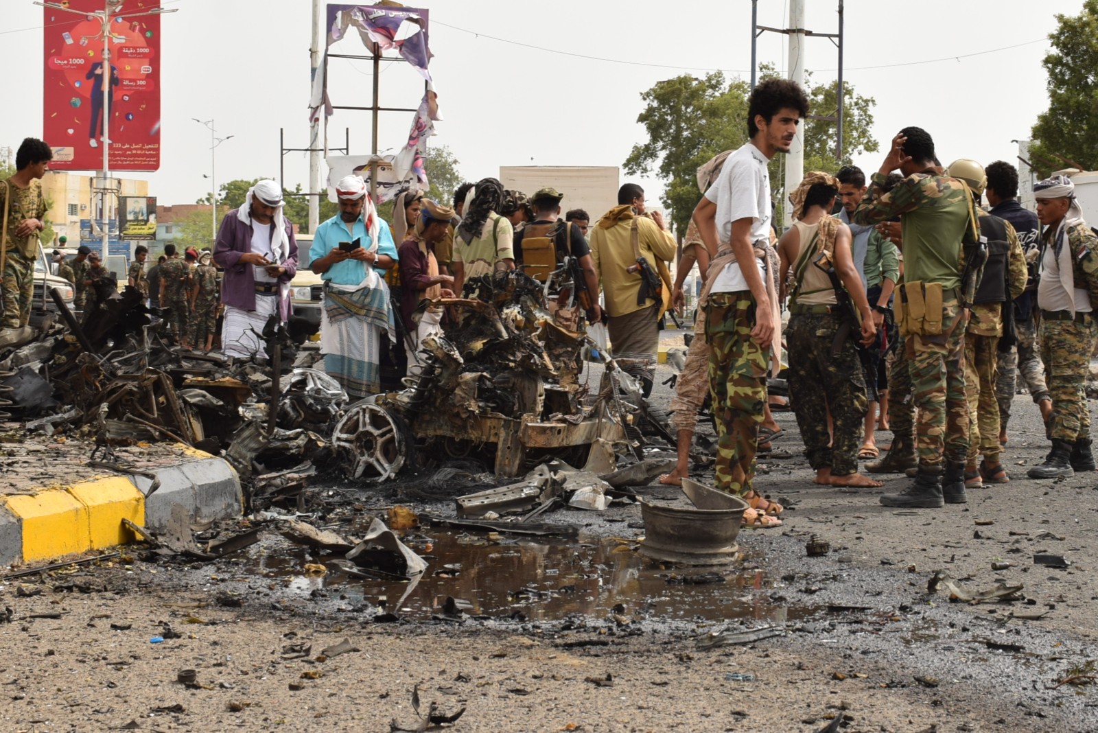 6月29日,安全人員聚集在也門亞丁的汽車炸彈襲擊現(xiàn)場。