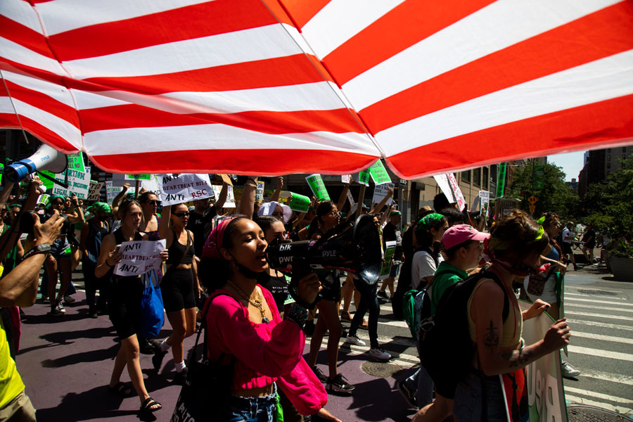 當(dāng)日,墮胎權(quán)支持者在美國紐約舉行示威游行。美國聯(lián)邦最高法院6月24日推翻近半個(gè)世紀(jì)前在聯(lián)邦層面確立墮胎權(quán)的判例“羅訴韋德案”,取消對(duì)女性墮胎權(quán)的憲法保護(hù),引發(fā)廣泛爭(zhēng)議。