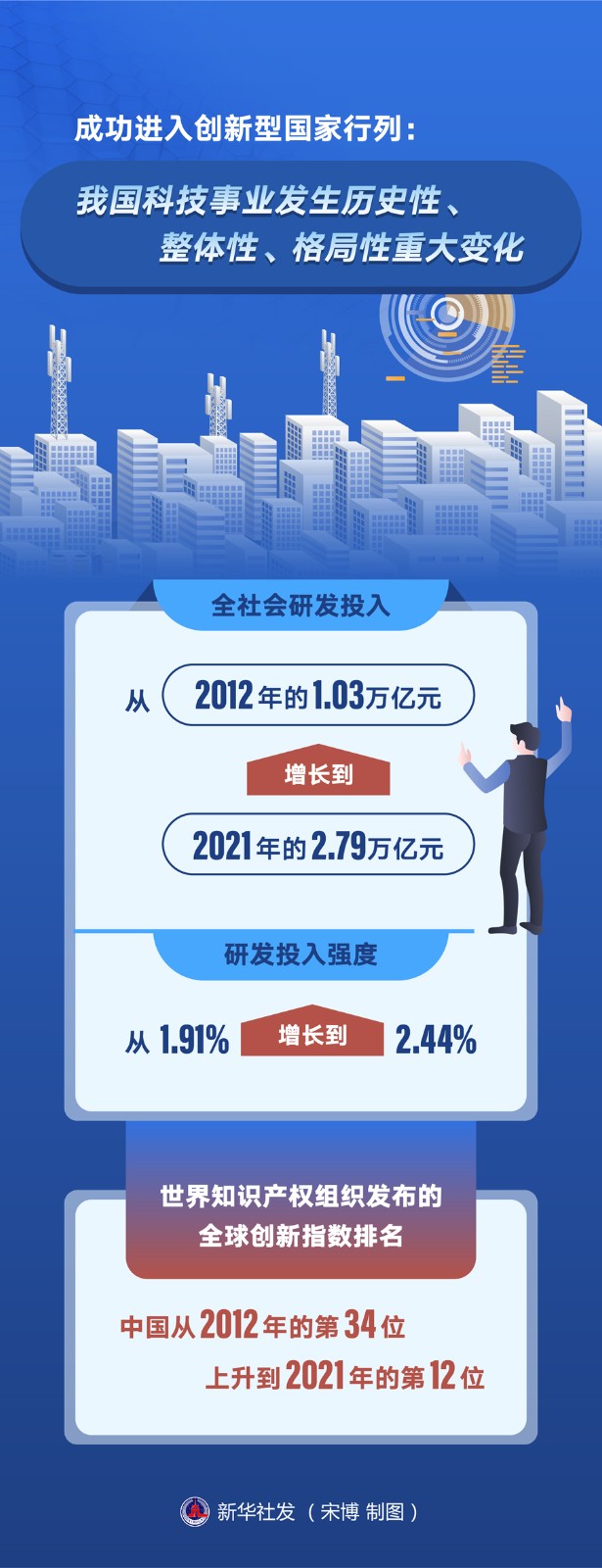 全社會研發(fā)投入從2012年的1.03萬億元增長到2021年的2.79萬億元,研發(fā)投入強度從1.91%增長到2.44%;世界知識產權組織發(fā)布的全球創(chuàng)新指數排名,中國從2012年的第34位上升到2021年的第12位……