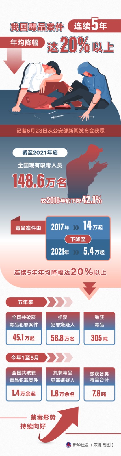 6月26日是第35個國際禁毒日。記者6月23日從公安部新聞發(fā)布會獲悉,截至2021年底,全國現(xiàn)有吸毒人員148.6萬名,較2016年底下降42.1%;毒品案件由2017年的14萬起下降至2021年的5.4萬起,連續(xù)5年年均降幅達(dá)20%以上。