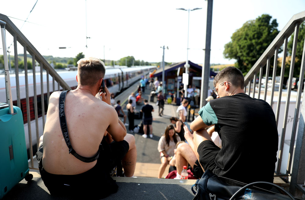 7月18日,在英國阿爾恩茅斯火車站,由于天氣炎熱,前方線路起火,一列由愛丁堡出發(fā)至倫敦的火車被迫在此停止運(yùn)行,旅客滯留在火車站。