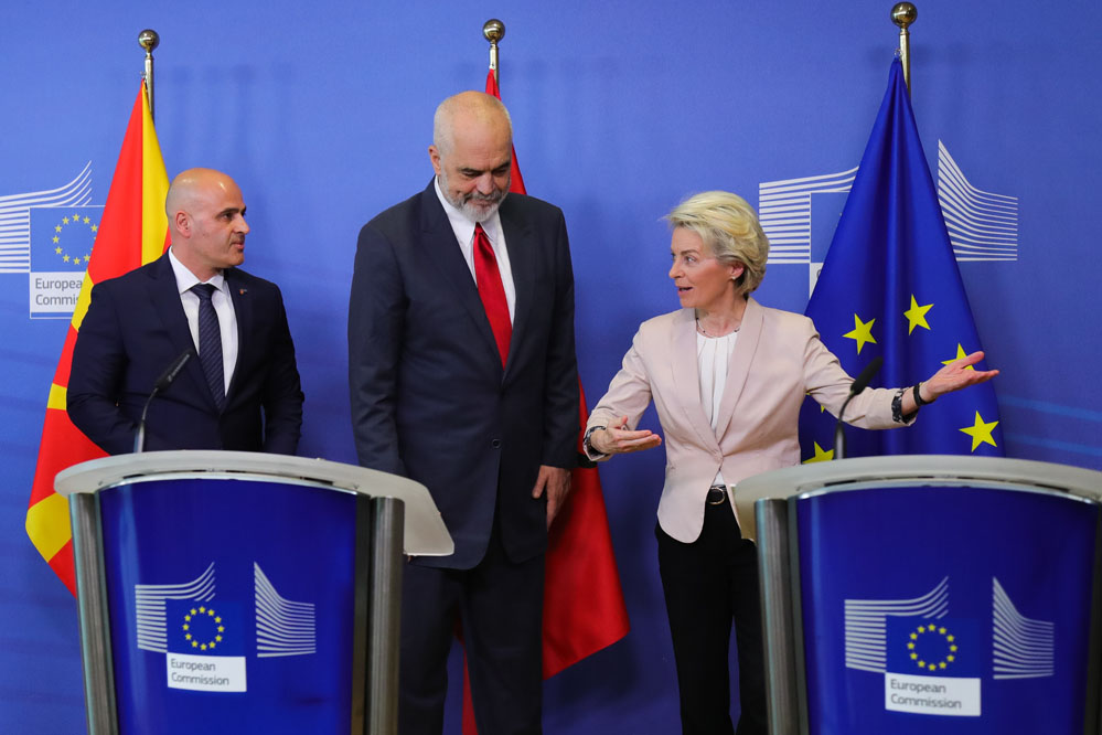 在推遲了近兩年后,歐盟19日正式與阿爾巴尼亞和北馬其頓開啟入盟談判。當(dāng)天,歐盟與阿爾巴尼亞和北馬其頓在布魯塞爾召開政府間會(huì)議。歐盟委員會(huì)主席馮德萊恩、歐盟輪值主席國捷克總理菲亞拉、阿爾巴尼亞總理拉馬和北馬其頓總理科瓦切夫斯基在會(huì)前舉行了聯(lián)合記者會(huì)。