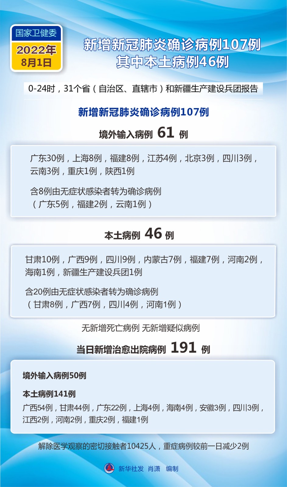 (圖表)國家衛(wèi)健委:8月1日新增新冠肺炎確診病例107例 其中本土病例46例