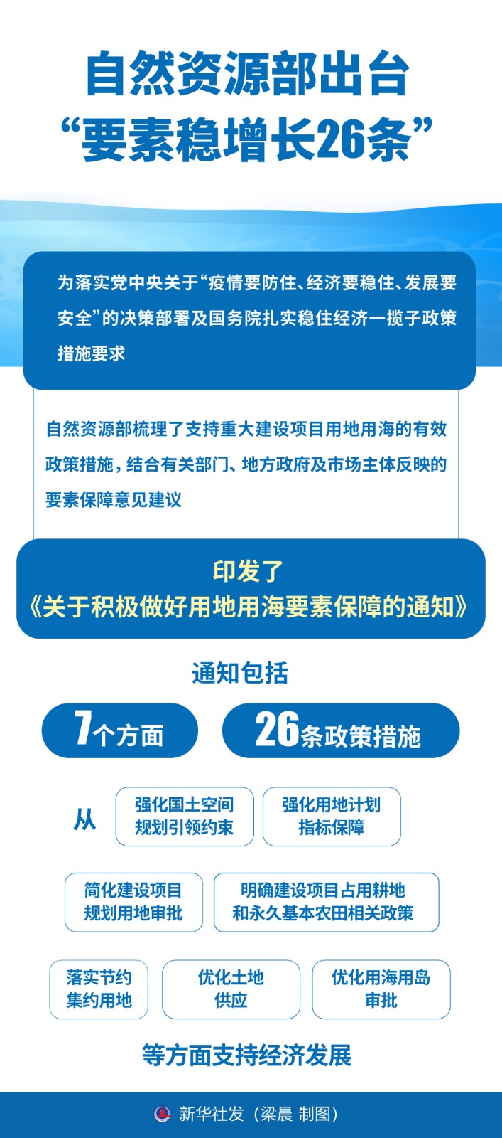 新華社記者8月8日在自然資源部新聞通氣會(huì)上獲悉,為落實(shí)黨中央關(guān)于“疫情要防住、經(jīng)濟(jì)要穩(wěn)住、發(fā)展要安全”的決策部署及國務(wù)院扎實(shí)穩(wěn)住經(jīng)濟(jì)一攬子政策措施要求,自然資源部梳理了支持重大建設(shè)項(xiàng)目用地用海的有效政策措施,結(jié)合有關(guān)部門、地方政府及市場主體反映的要素保障意見建議,印發(fā)了《關(guān)于積極做好用地用海要素保障的通知》,通知包括7個(gè)方面26條政策措施,從強(qiáng)化國土空間規(guī)劃引領(lǐng)約束、強(qiáng)化用地計(jì)劃指標(biāo)保障、簡化建設(shè)項(xiàng)目規(guī)劃用地審批、明確建設(shè)項(xiàng)目占用耕地和永久基本農(nóng)田相關(guān)政策、落實(shí)節(jié)約集約用地、優(yōu)化土地供應(yīng)、優(yōu)化用海用島審批等方面支持經(jīng)濟(jì)發(fā)展。