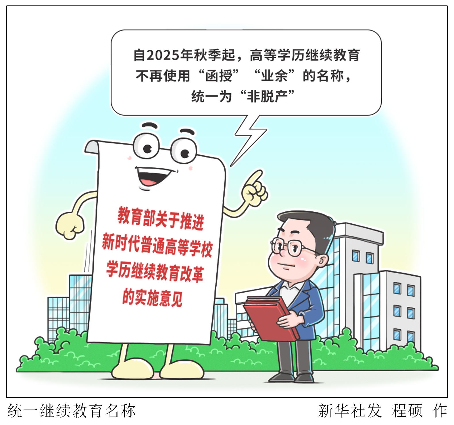 記者8月17日從教育部獲悉,《教育部關(guān)于推進(jìn)新時(shí)代普通高等學(xué)校學(xué)歷繼續(xù)教育改革的實(shí)施意見》近日印發(fā),要求自2025年秋季起,高等學(xué)歷繼續(xù)教育不再使用“函授”“業(yè)余”的名稱,統(tǒng)一為“非脫產(chǎn)”,主辦高??筛鶕?jù)專業(yè)特點(diǎn)和學(xué)生需求等,靈活采取線上線下相結(jié)合形式教學(xué)。