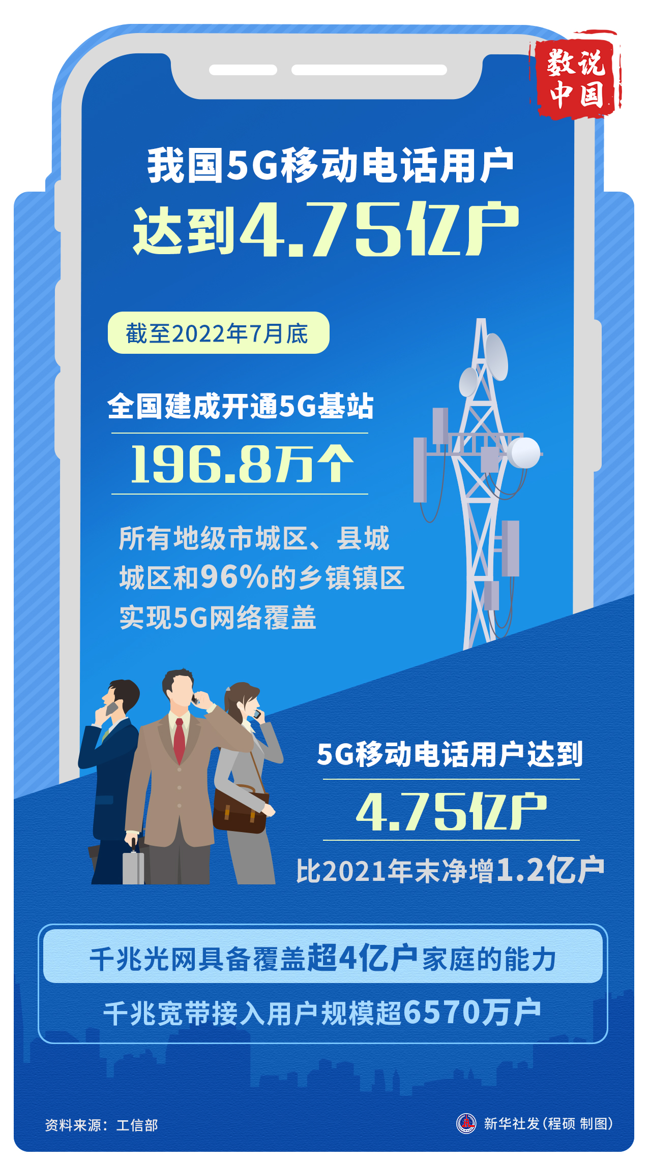 工信部信息通信發(fā)展司司長謝存8月19日表示,截至7月底,全國建成開通5G基站196.8萬個,所有地級市城區(qū)、縣城城區(qū)和96%的鄉(xiāng)鎮(zhèn)鎮(zhèn)區(qū)實現5G網絡覆蓋,5G移動電話用戶達到4.75億戶,比2021年末凈增1.2億戶,千兆光網具備覆蓋超4億戶家庭的能力,千兆寬帶接入用戶規(guī)模超6570萬戶。