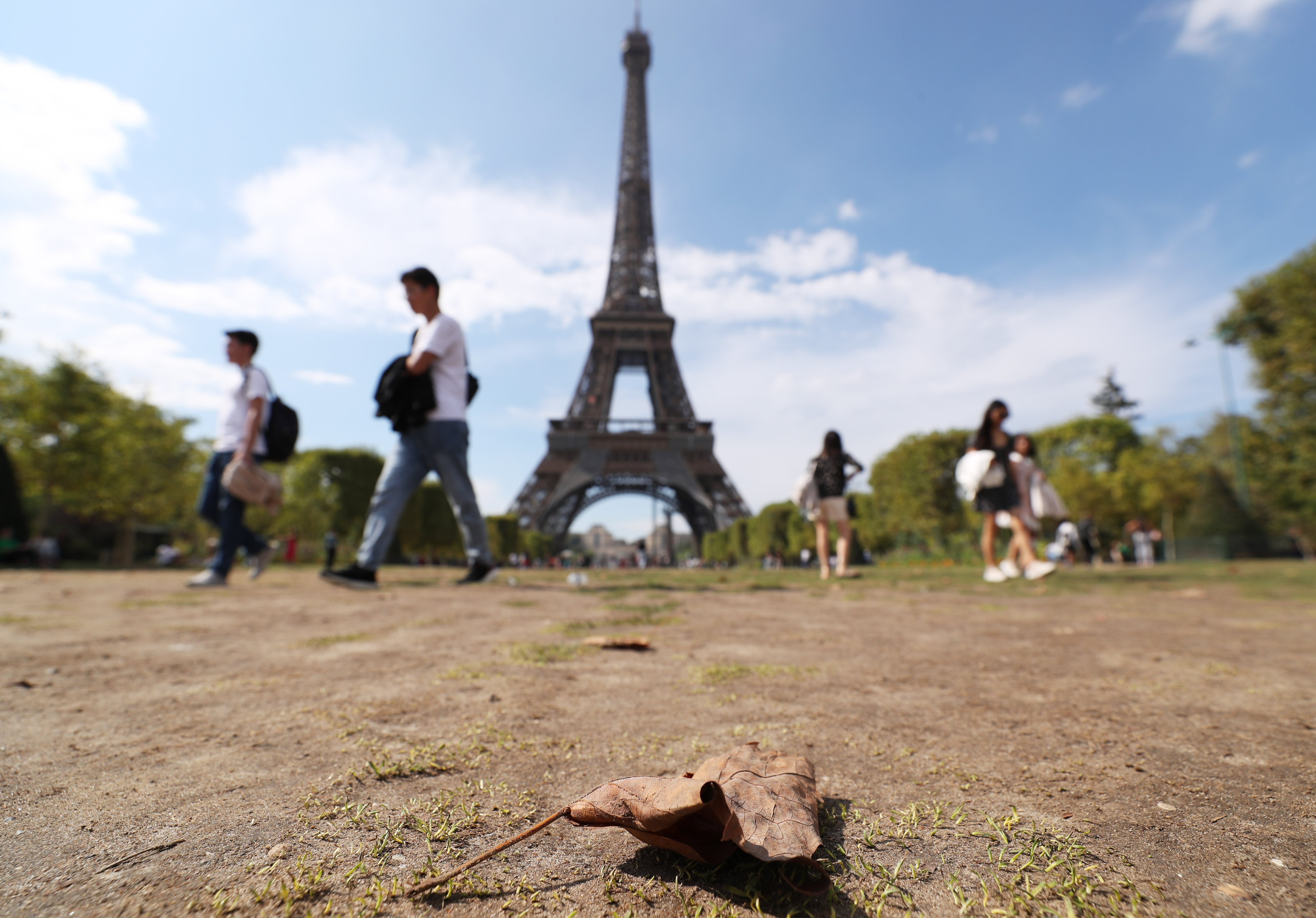 這是8月17日在法國巴黎戰(zhàn)神廣場拍攝的干枯的草坪和干枯脫落的樹葉。