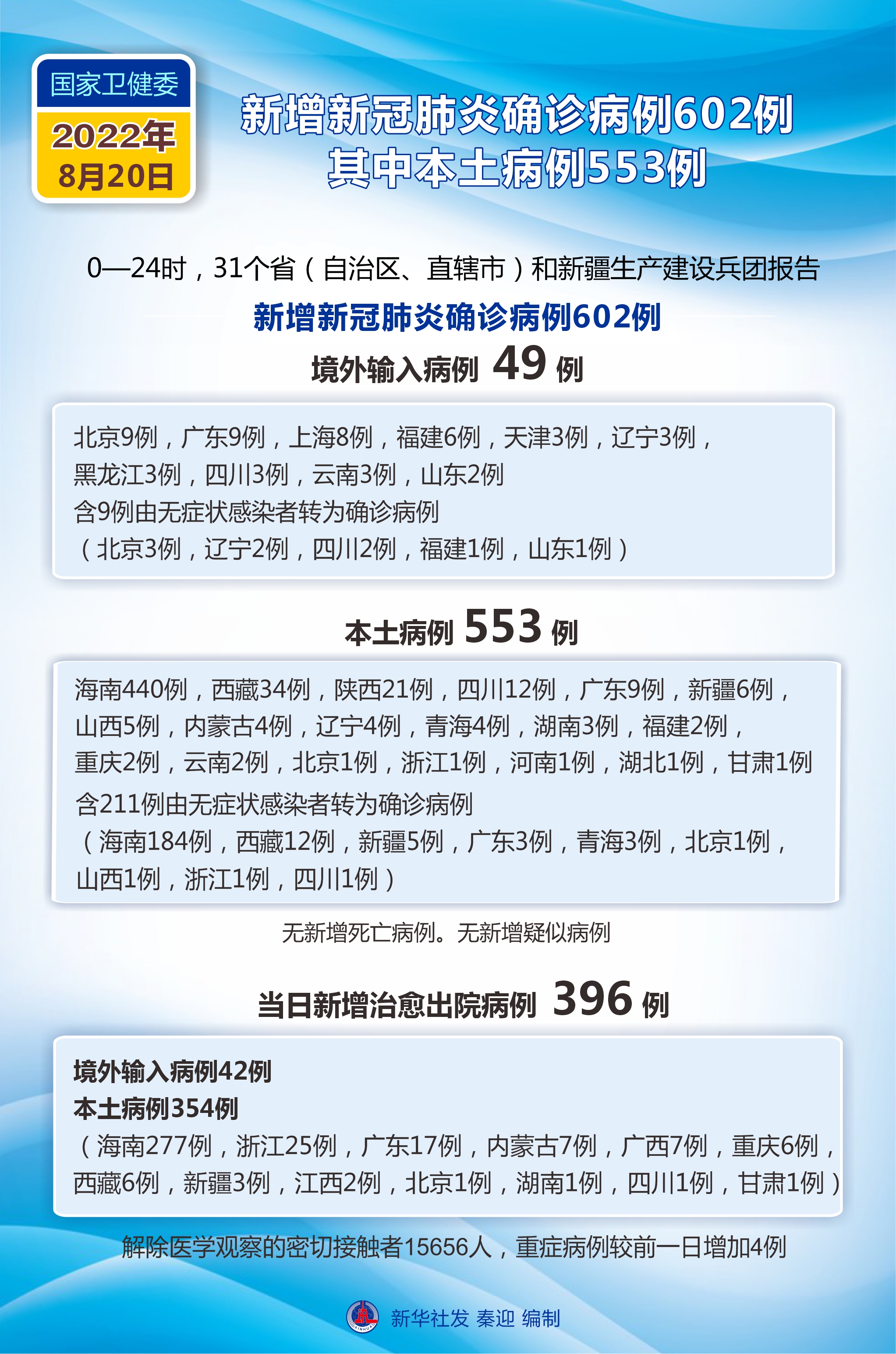 國家衛(wèi)健委:8月20日新增新冠肺炎確診病例602例 其中本土病例553例