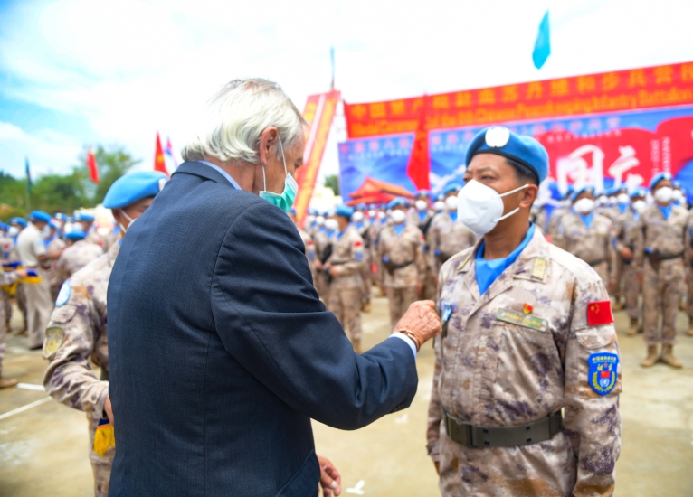 9月30日,在聯(lián)合國(guó)駐南蘇丹特派團(tuán)超級(jí)營(yíng)地,聯(lián)合國(guó)秘書(shū)長(zhǎng)特別代表兼聯(lián)南蘇團(tuán)團(tuán)長(zhǎng)尼古拉斯·海瑟姆為中國(guó)維和官兵授勛。