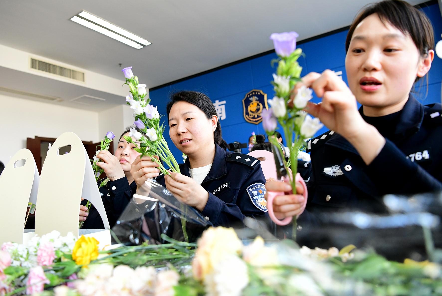 3月7日,安徽省阜南縣公安局女民輔警在花藝?yán)蠋煹闹笇?dǎo)下插花。為慶?!叭恕眹?guó)際婦女節(jié),阜南縣公安局舉辦“學(xué)花藝 慶節(jié)日”活動(dòng)。