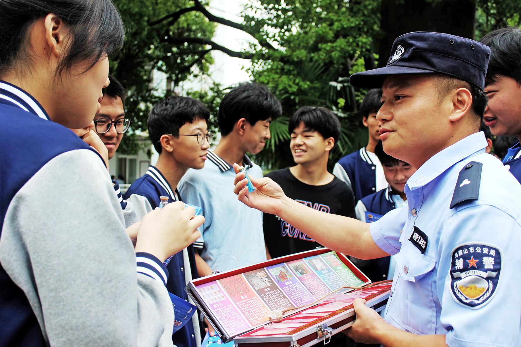6月26日,安徽省當(dāng)涂縣公安局石橋派出所民輔警用仿真毒品樣本向?qū)W生講解毒品危害。