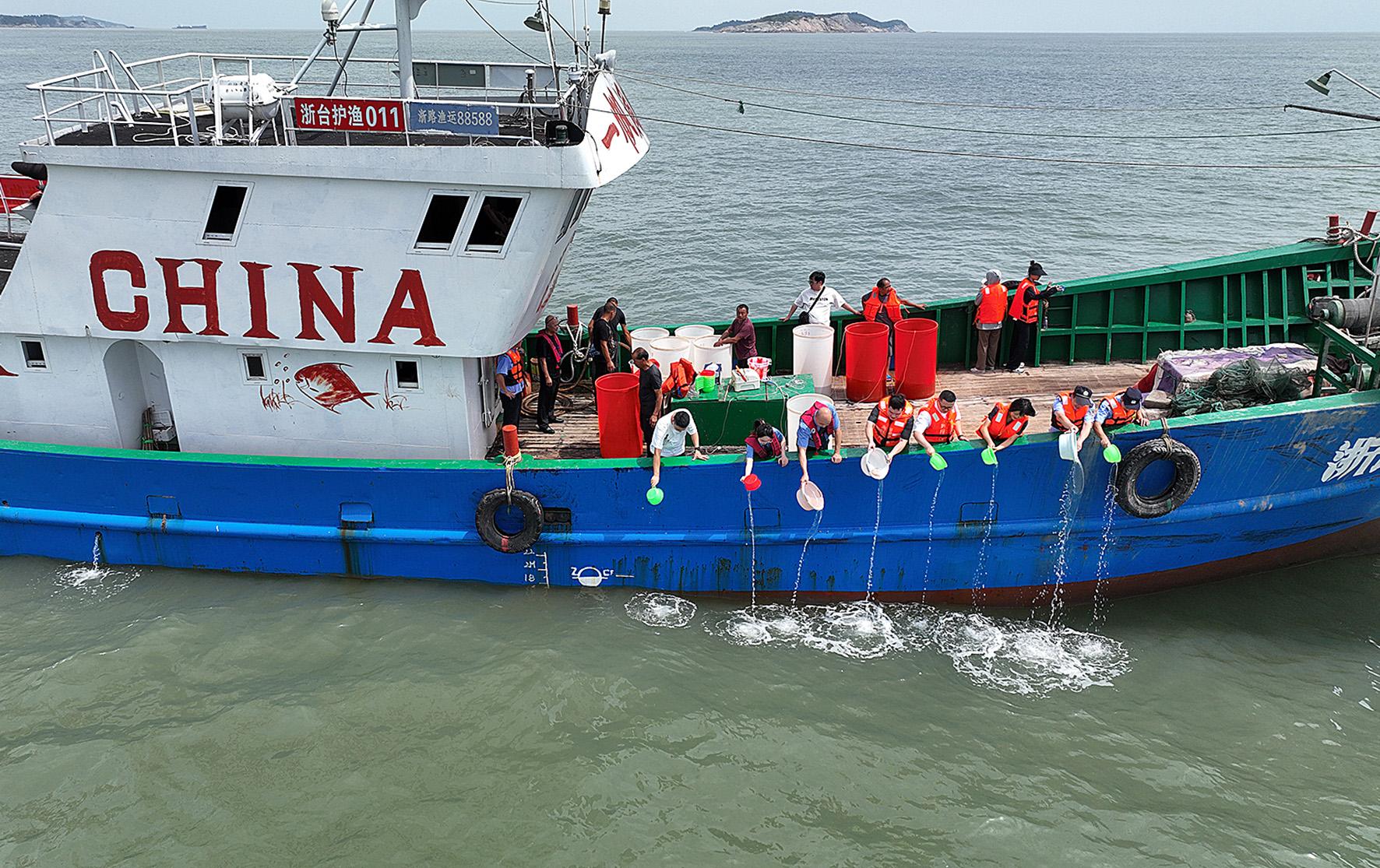 7月19日,在浙江省臺(tái)州市路橋區(qū)金清鎮(zhèn)近海海域,當(dāng)?shù)攸h員干部、政法干警、人大代表、政協(xié)委員、漁民代表等開展海洋增殖放流活動(dòng),向大海投放蝦苗2050萬尾。