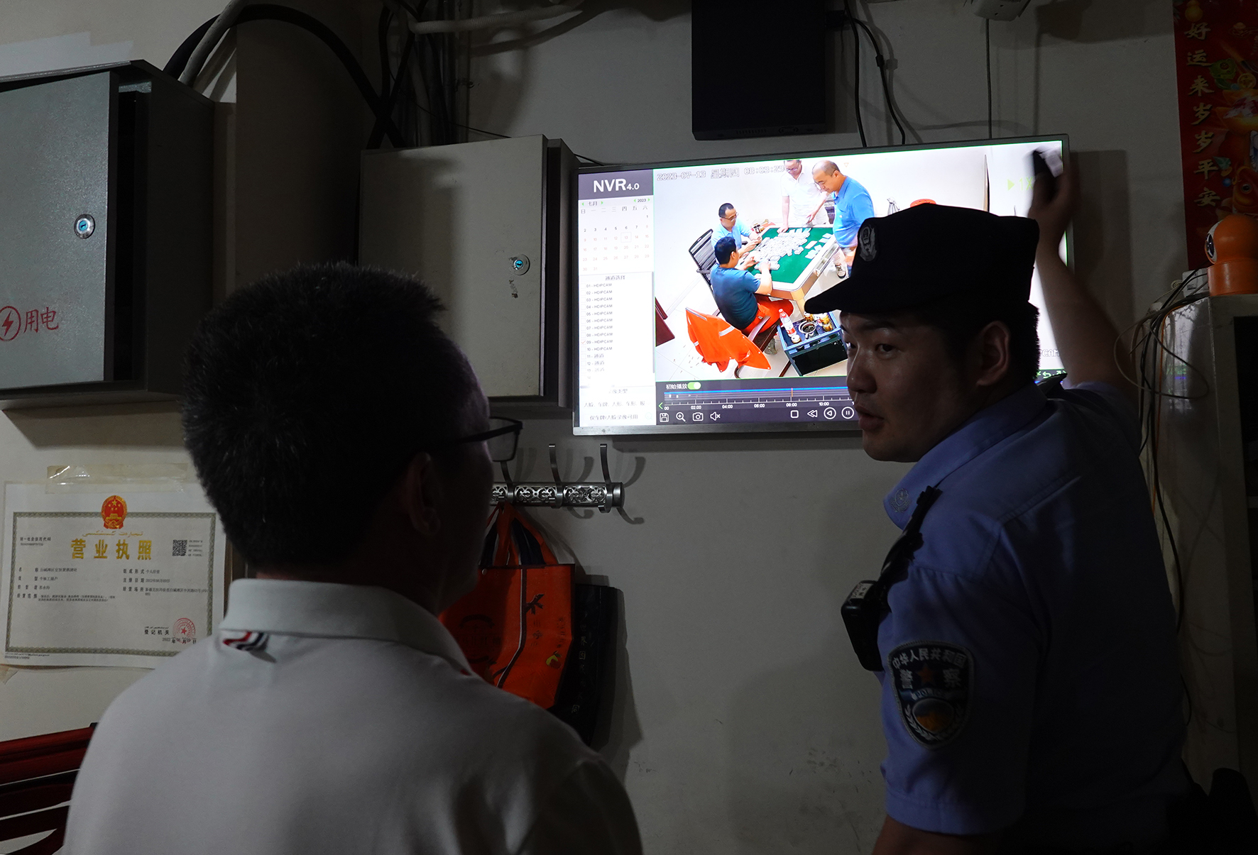 圖為民警在一家棋牌室進(jìn)行巡查。