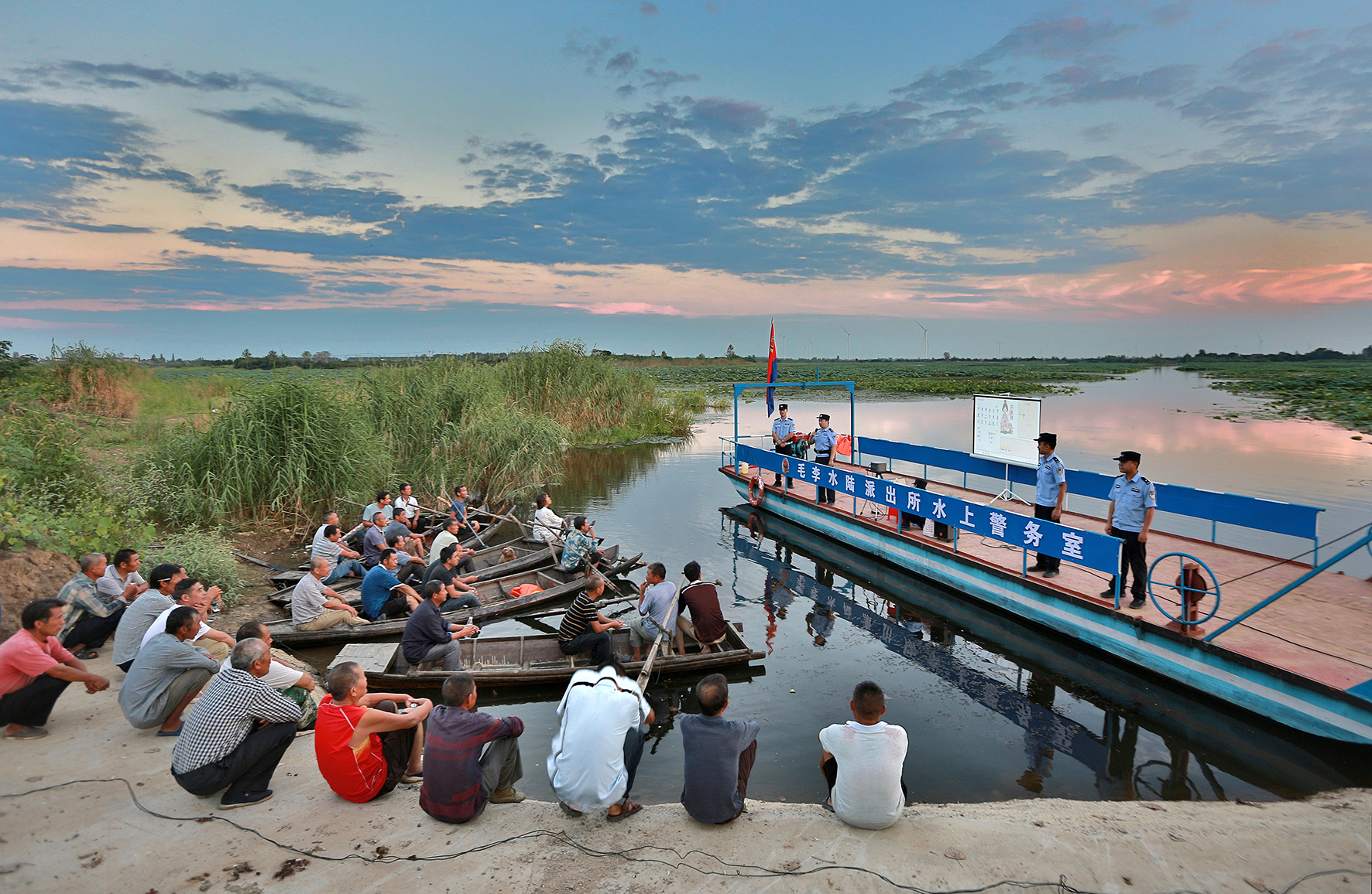 圖為9月14日傍晚,毛李水陸派出所民警在借糧湖畔,通過“流動防?!逼桨舱n堂為村民放送反詐電影。