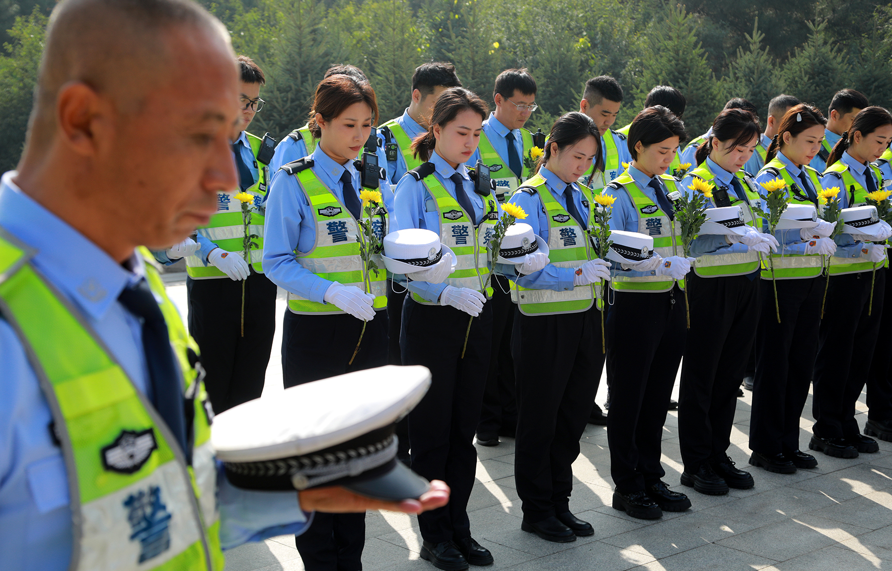 9月27日,遼寧省阜新市公安局交警支隊海州大隊民警在三一八公園烈士紀念碑前舉行紀念烈士活動。