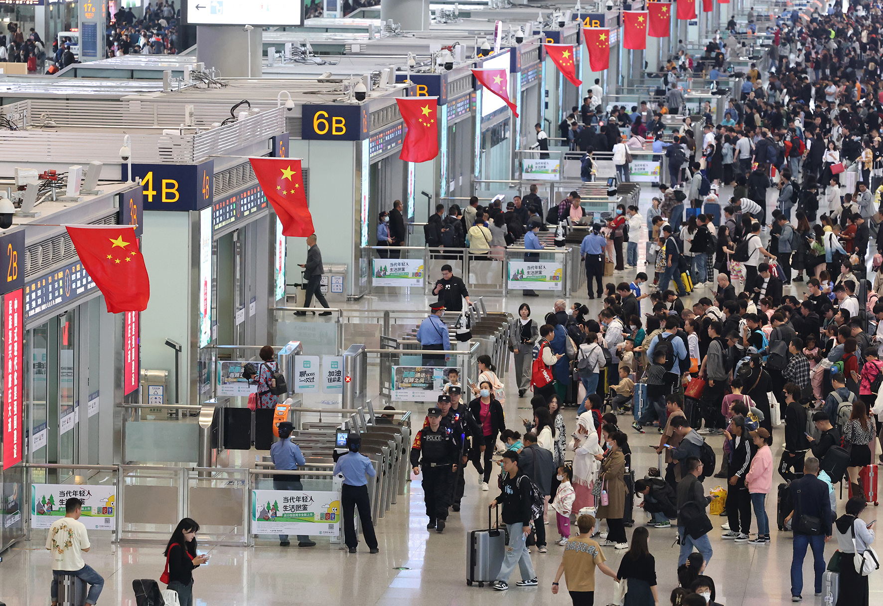 圖為特警在西安北站人流如織的候車大廳巡邏。