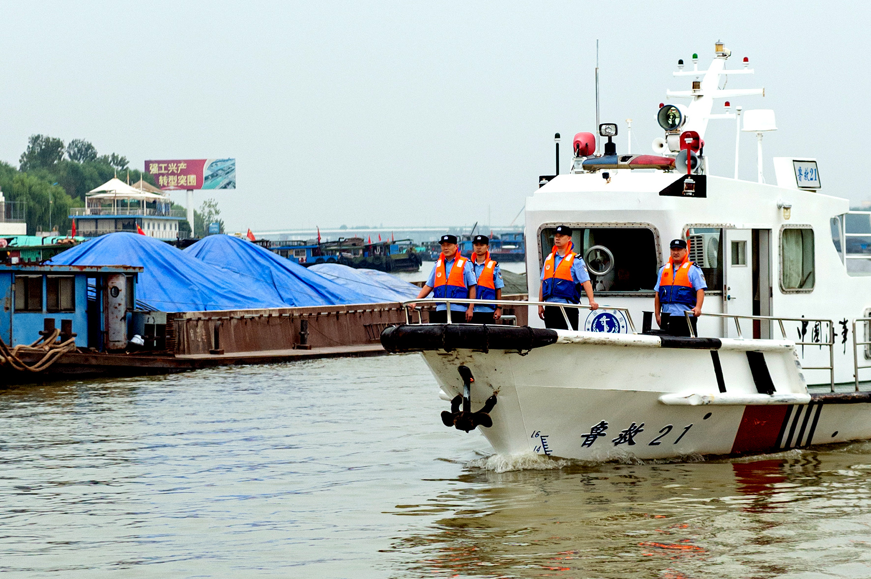 9月28日,山東省棗莊市公安局臺(tái)兒莊分局水上派出所民警在運(yùn)河航道進(jìn)行水域巡邏。