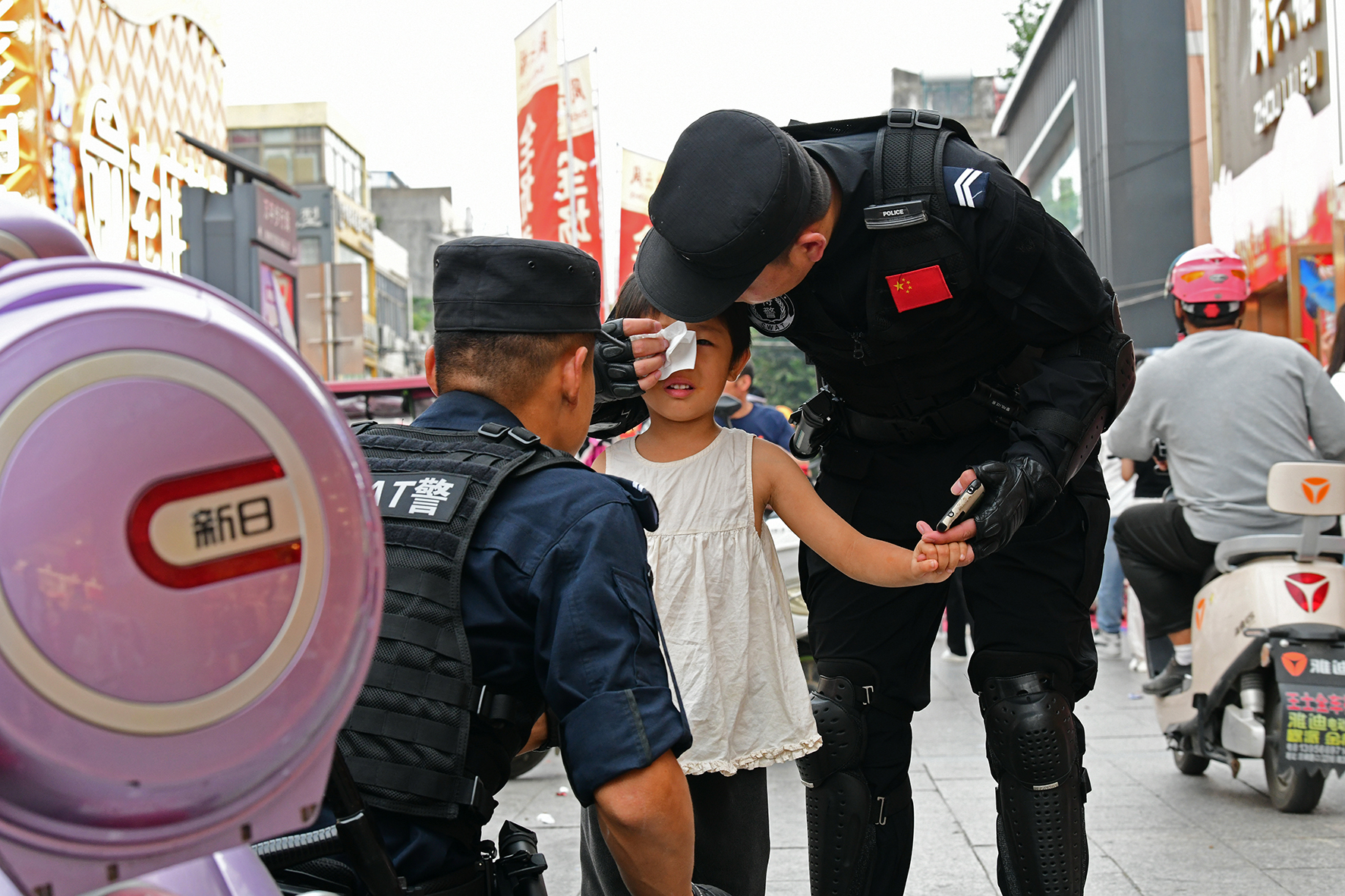 10月1日,安徽省阜南縣巡防大隊民輔警在城區(qū)萬宇商業(yè)街區(qū)巡邏時發(fā)現(xiàn)一名走失幼童。經(jīng)過半小時的尋找,終于在一地下商場內(nèi)通過喊話找到了幼童家人。