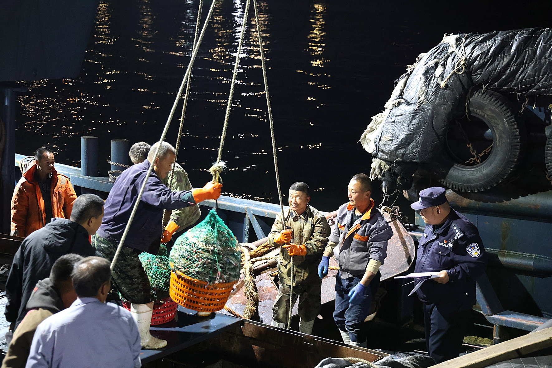 10月6日,遼寧丹東邊境管理支隊新溝邊境派出所民警對漁船出海捕撈的海產(chǎn)品進行報備清點核查。