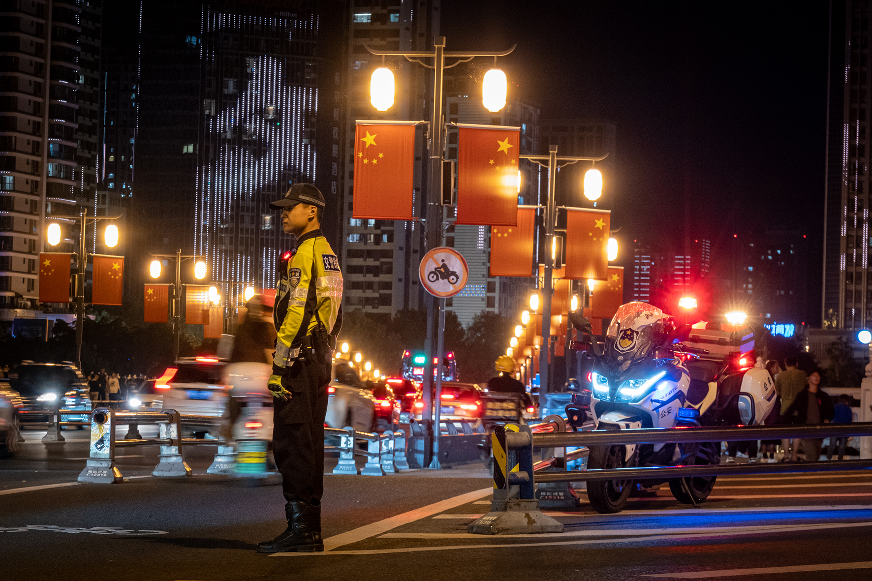 10月2日晚,四川省綿陽市公安局交警支隊執(zhí)勤民警在越王樓景區(qū)附近疏導(dǎo)交通。