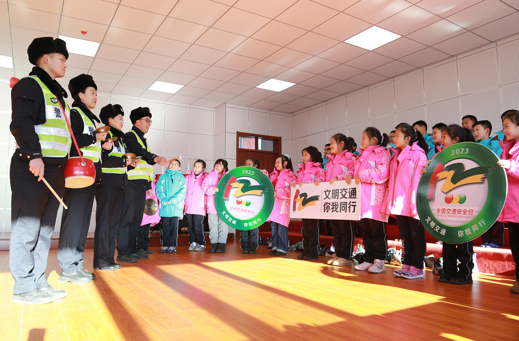 圖為民警為同學(xué)們表演交通安全知識(shí)“三句半”。