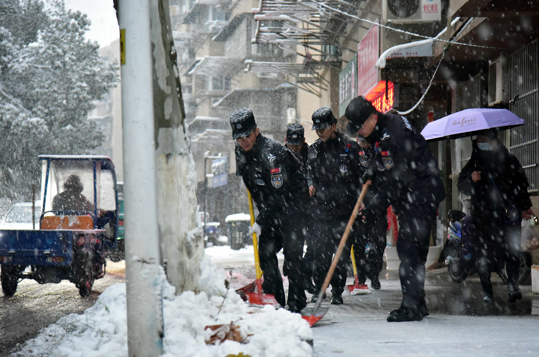 12月18日,安徽省當(dāng)涂縣突降大雪。當(dāng)涂縣公安局第一時間成立了黨員突擊隊,迅速投入到河濱路鏟雪一線,確保路面安全。