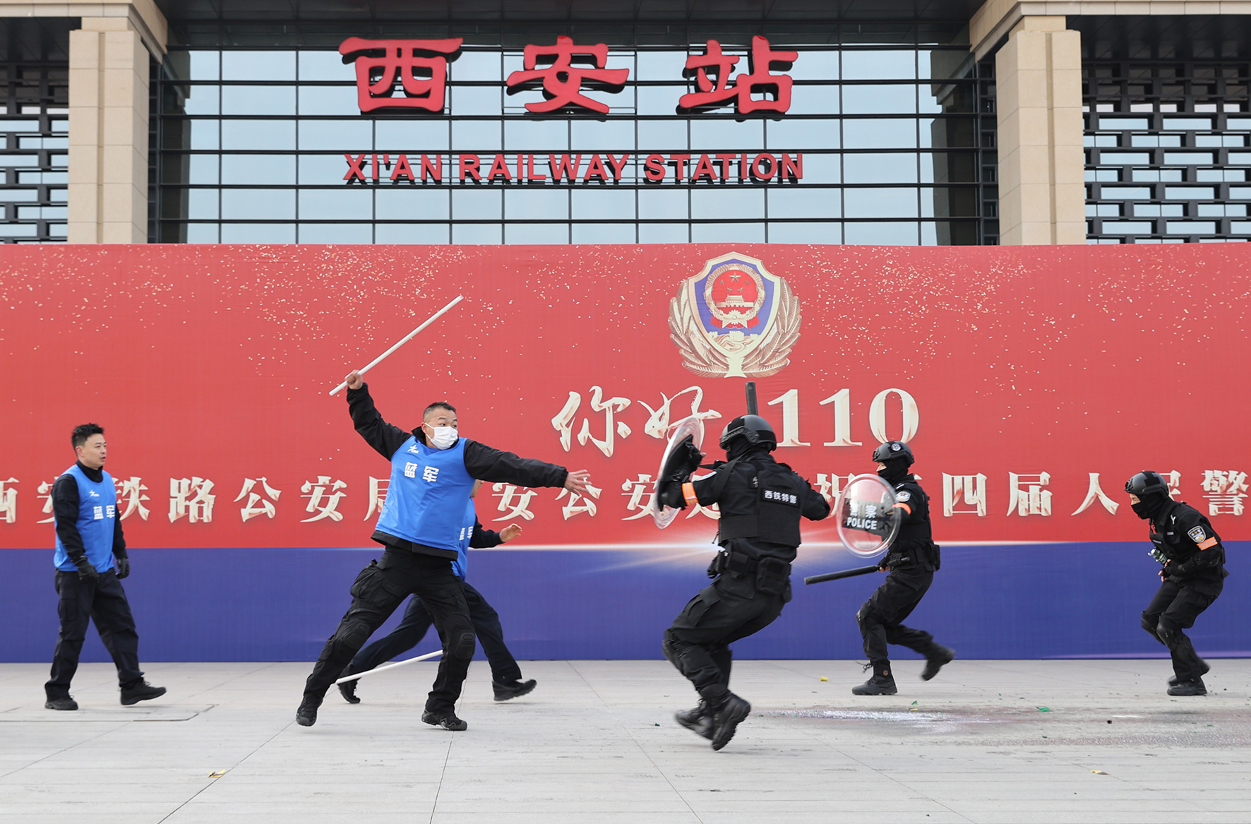 1月7日,西安火車站北廣場,西安鐵路公安處特警隊(duì)員在進(jìn)行特警技戰(zhàn)術(shù)演練。