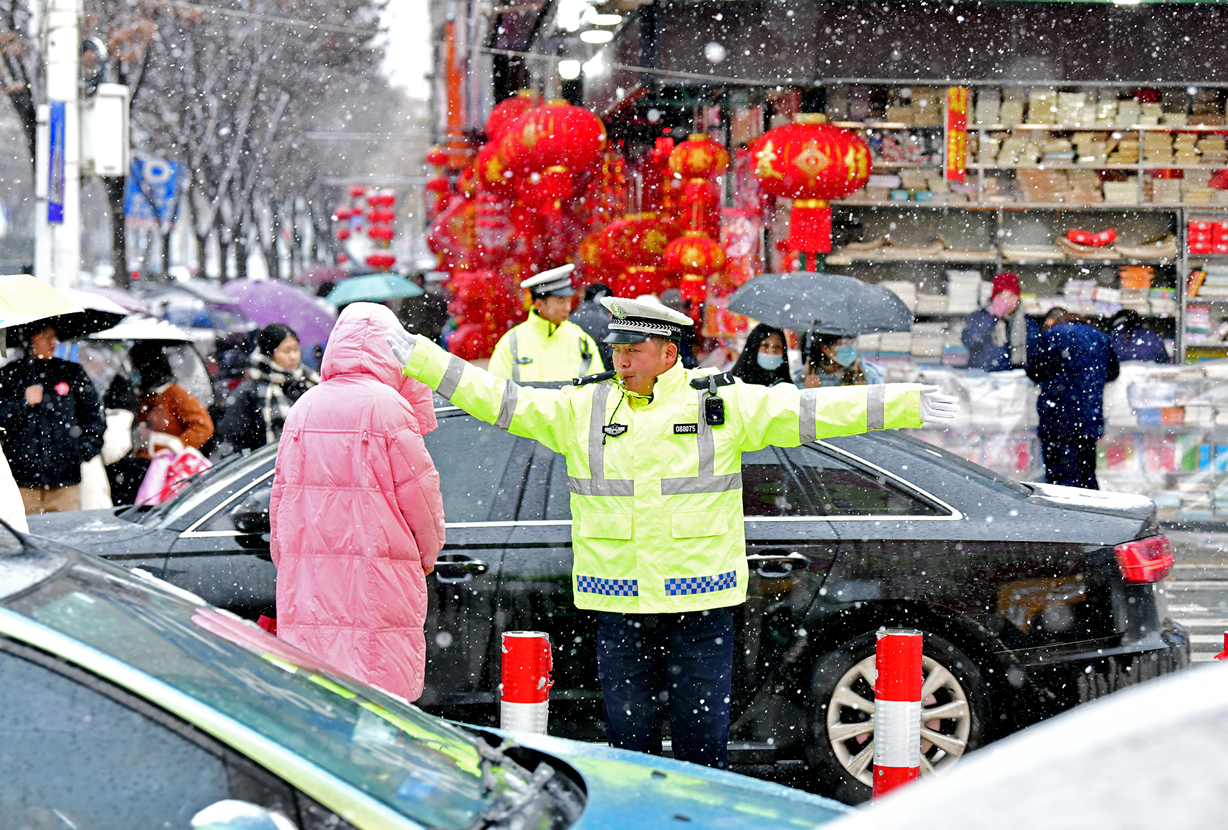 2月1日,安徽省阜南縣交警在城區(qū)年貨街路口維持交通秩序。當(dāng)日,阜南縣公安局交管大隊(duì)啟動(dòng)春運(yùn)雨雪惡劣天氣道路交通應(yīng)急預(yù)案,在城區(qū)主要路口設(shè)置高峰崗、國(guó)省道路段加大巡邏力度,確保群眾節(jié)日期間出行安全暢通。