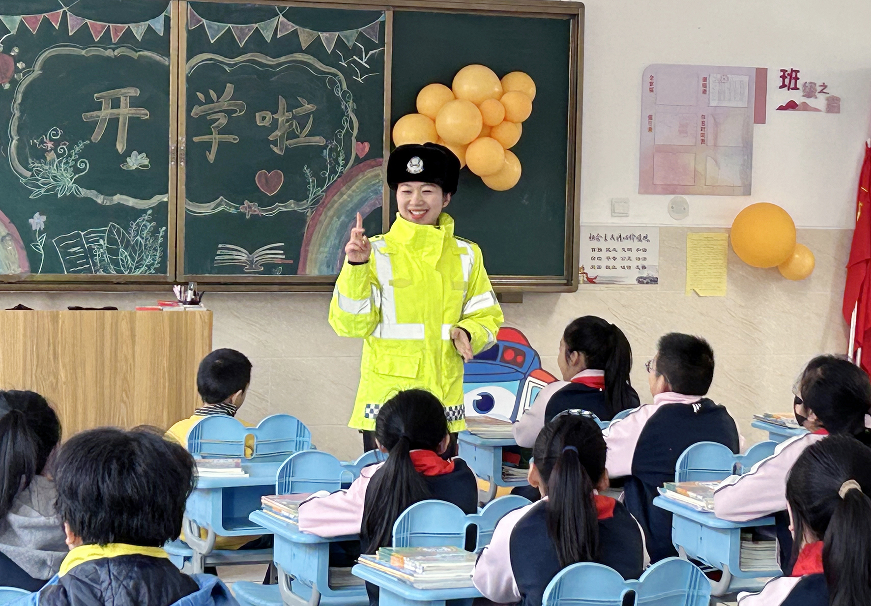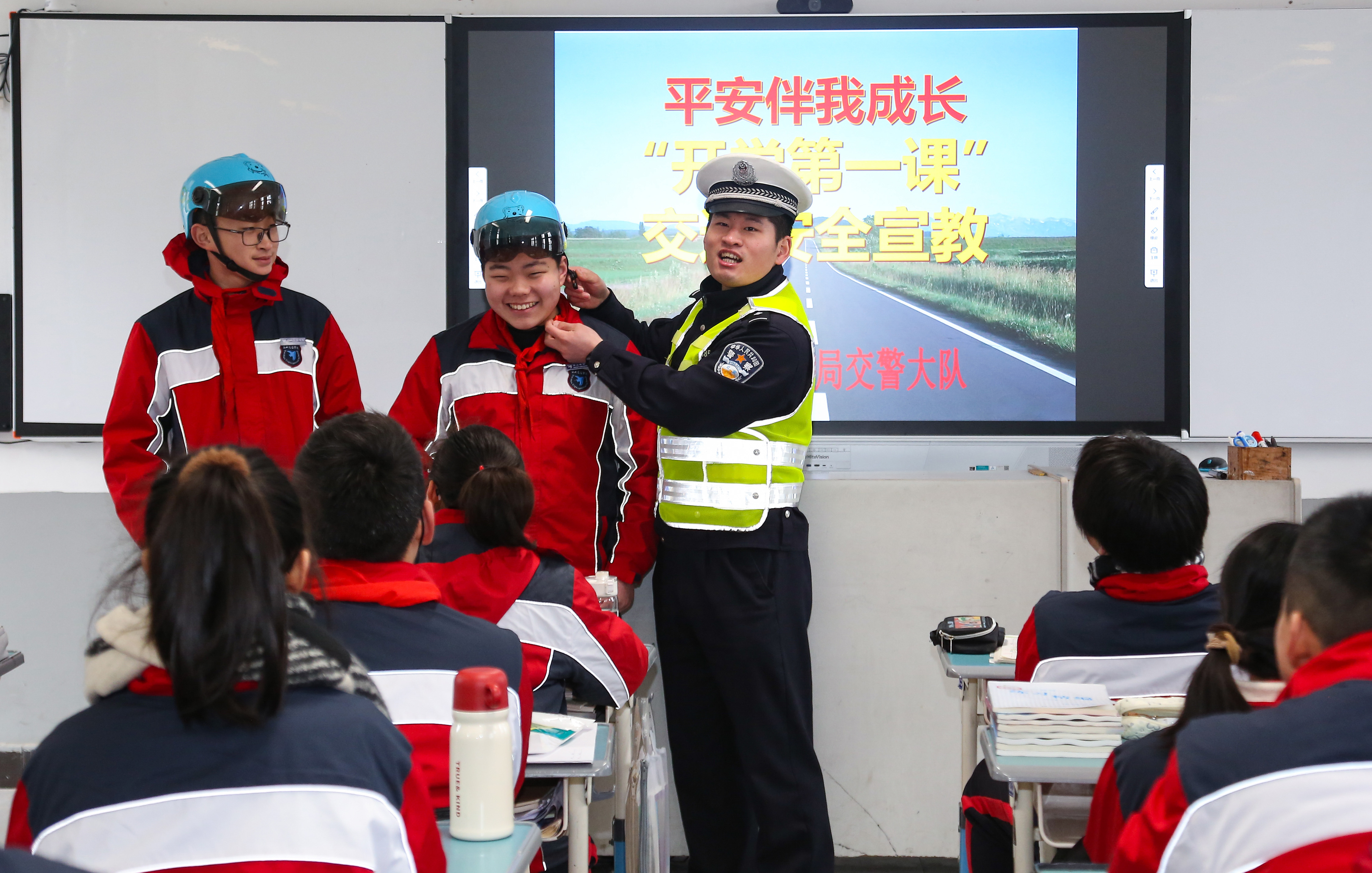 2月26日,山東省煙臺市公安局交警支隊第五大隊民警在為高新區(qū)益文小學(xué)的同學(xué)們上“開學(xué)第一課”,普及交通安全知識。