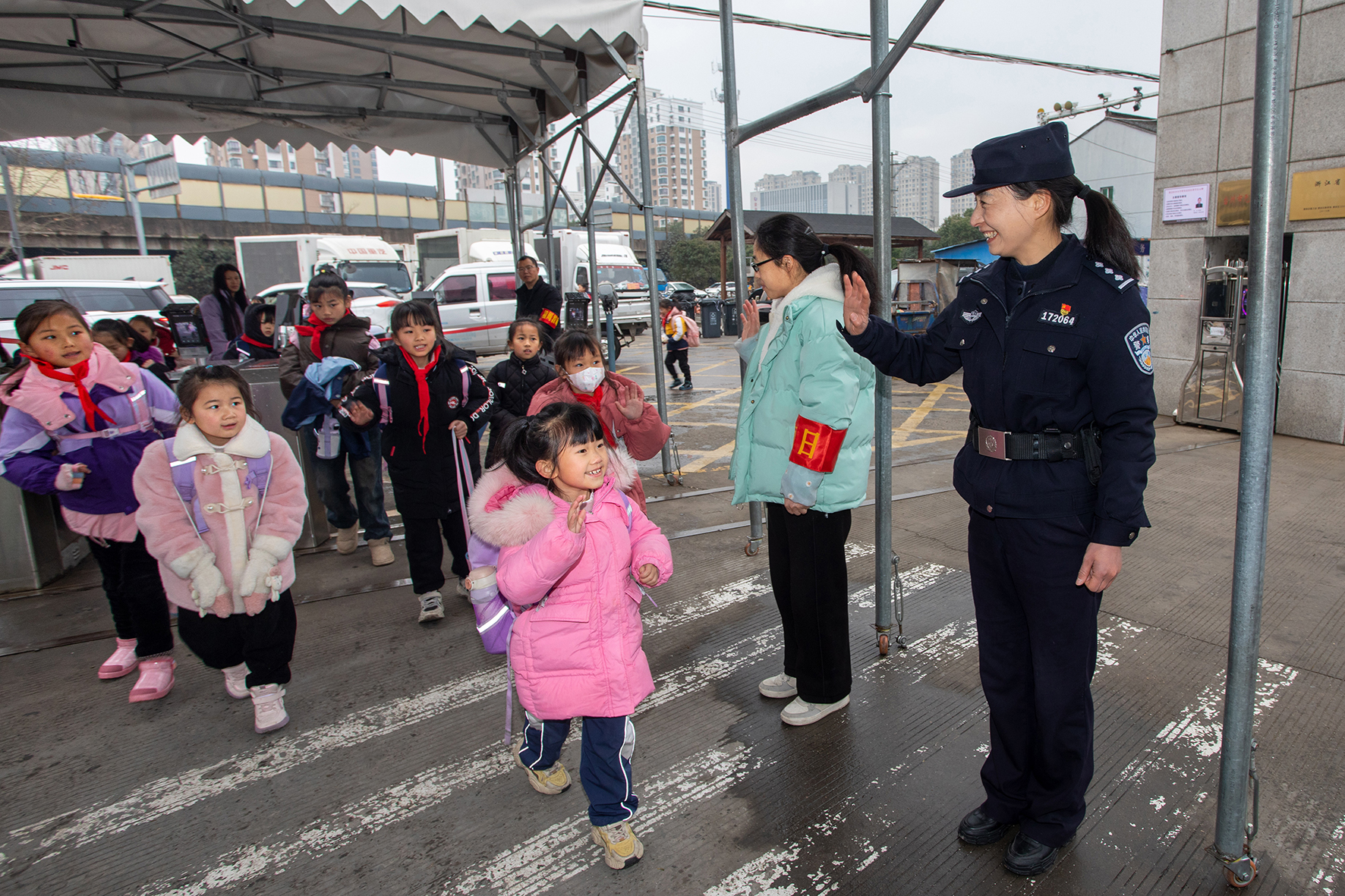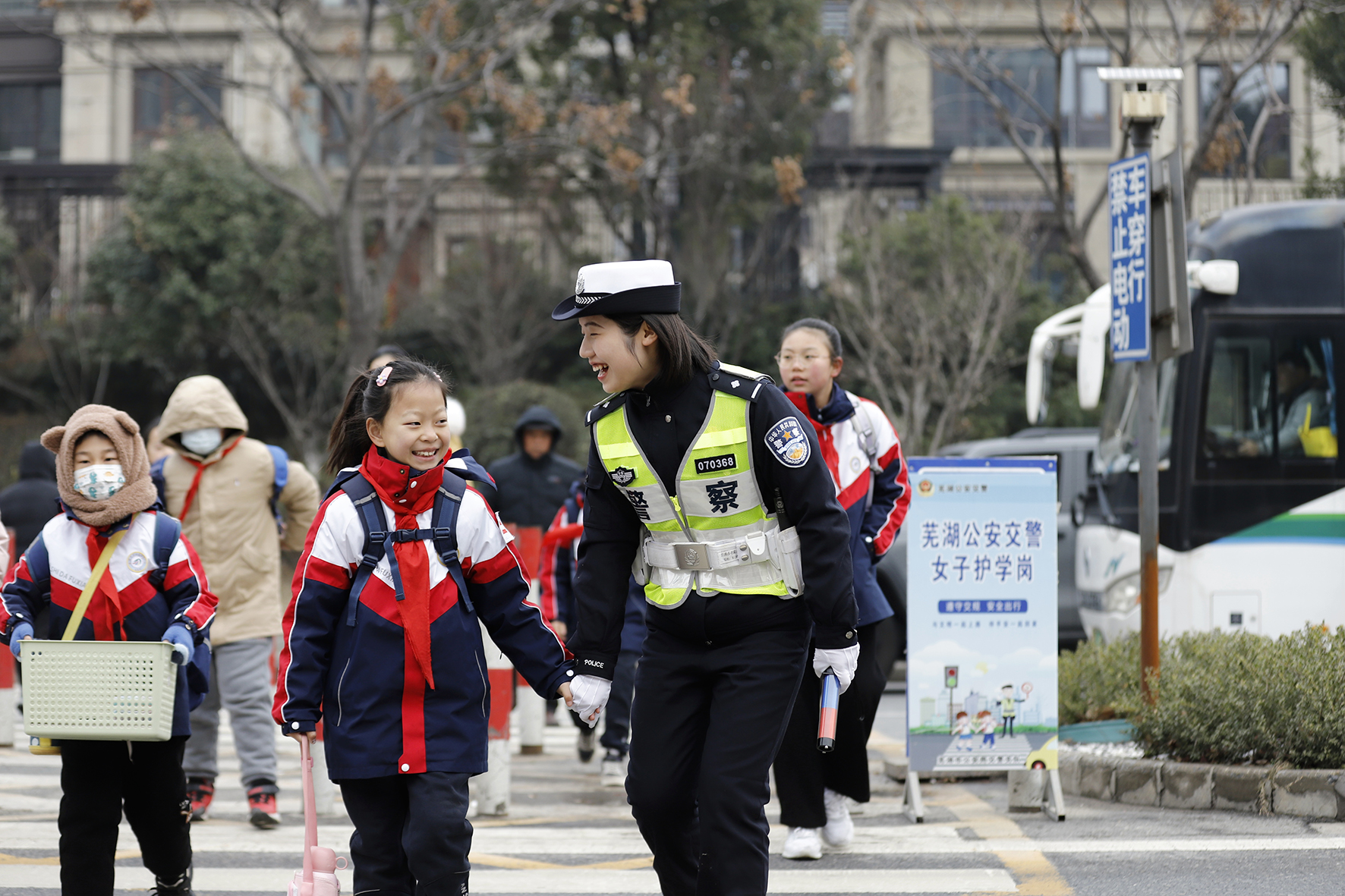 2月26日,安徽省蕪湖市弋江大隊女子護(hù)學(xué)崗民警在安師大附屬小學(xué)(西校區(qū))護(hù)送上學(xué)孩子過馬路,確保學(xué)生上放學(xué)安全。
