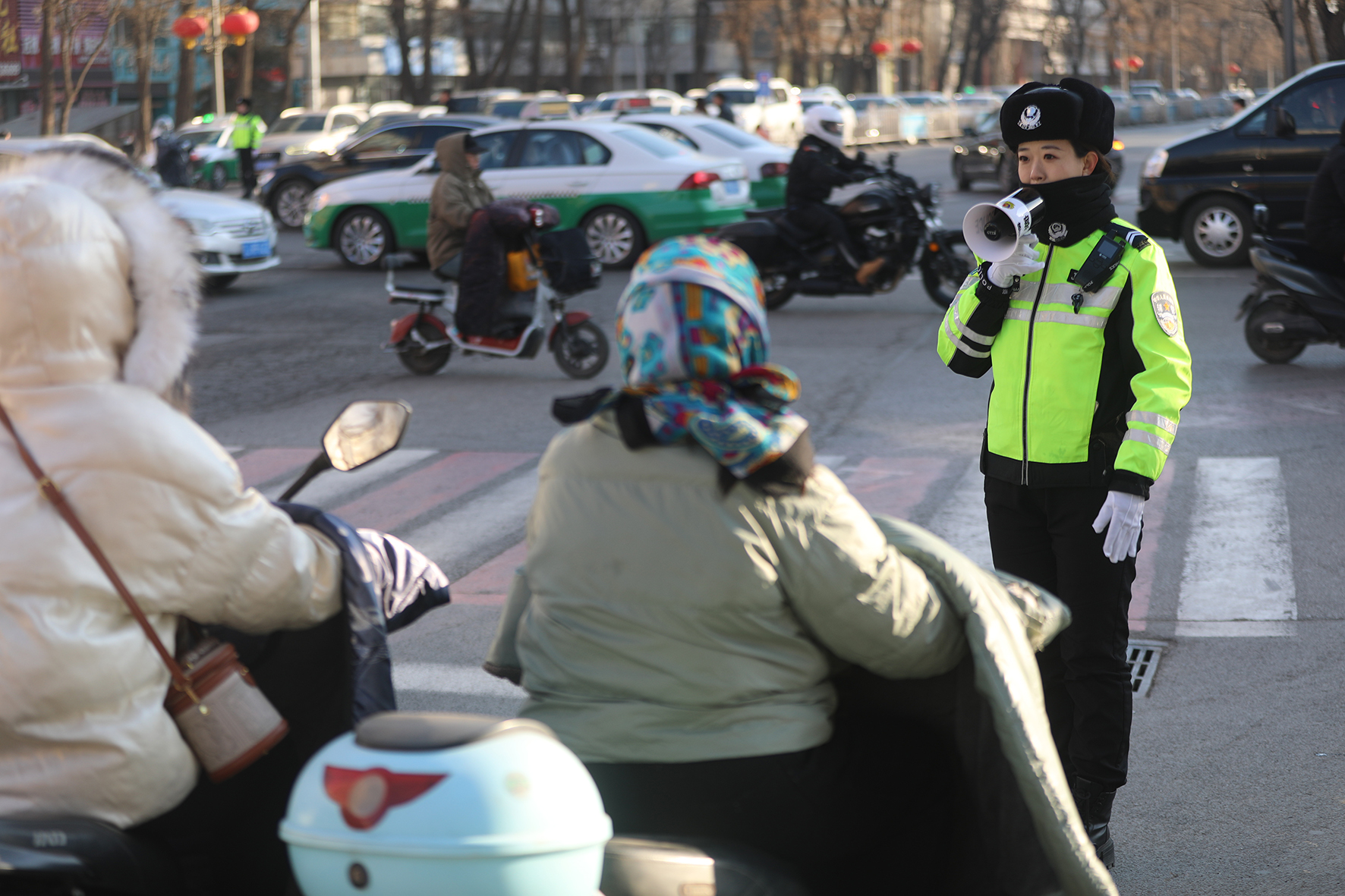 3月12日早高峰時(shí)段,遼寧省阜新市公安局交通警察支隊(duì)海州大隊(duì)民警輔警在花園崗路口對騎電動自行車沒有佩戴頭盔的市民進(jìn)行勸導(dǎo)。