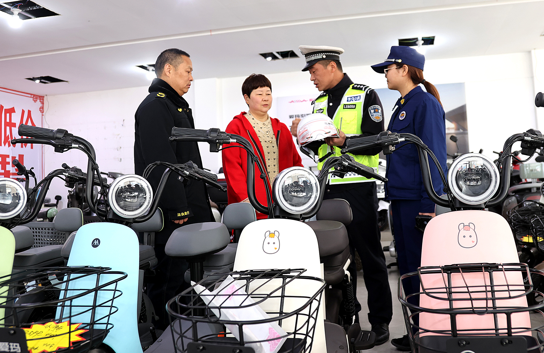 3月14日,陜西省大荔縣公安局交警大隊(duì)聯(lián)合市場(chǎng)監(jiān)管局、消防大隊(duì),走進(jìn)轄區(qū)電動(dòng)車(chē)銷(xiāo)售點(diǎn)開(kāi)展電動(dòng)車(chē)質(zhì)量安全和頭盔質(zhì)量等宣傳檢查。