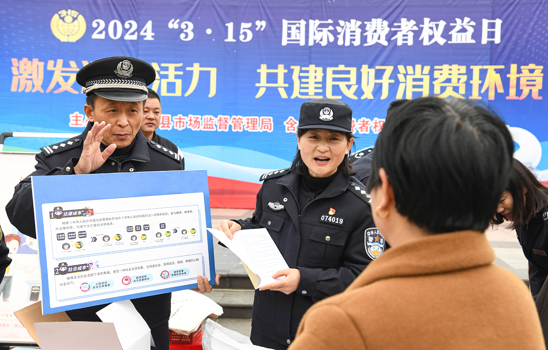 3月14日,安徽省含山縣公安局、市場(chǎng)監(jiān)督管理局等部門(mén)在玉龍廣場(chǎng)聯(lián)合開(kāi)展“國(guó)際消費(fèi)者權(quán)益日”宣傳活動(dòng)。