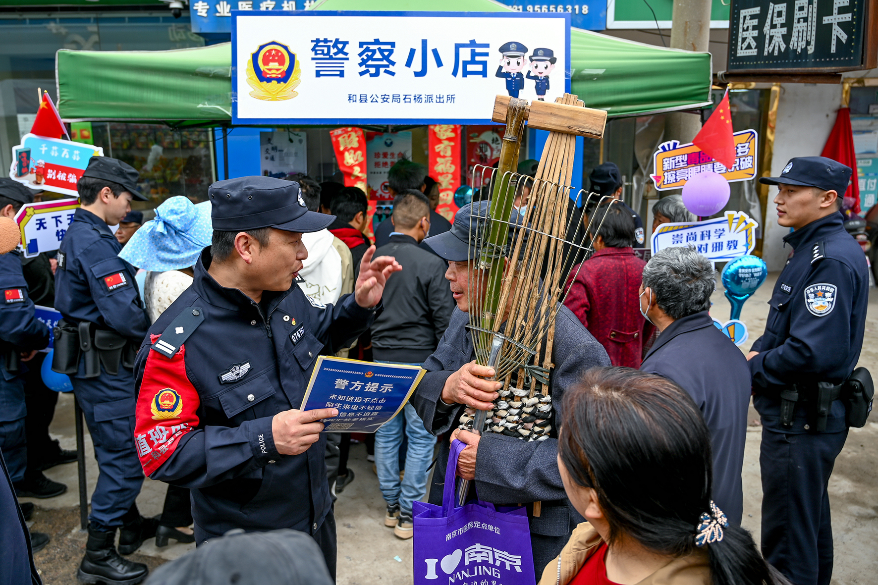 4月11日,農(nóng)歷三月初三,是安徽省馬鞍山市和縣石楊鎮(zhèn)綽廟社區(qū)一年一度群眾“趕廟會(huì)”的日子。和縣公安局在全力做好廟會(huì)安全服務(wù)保障的同時(shí),“警察小店”也“開張營業(yè)”,禁毒、反詐、反邪教以及國家安全等各種法治宣傳吸引了許多趕廟會(huì)的群眾。