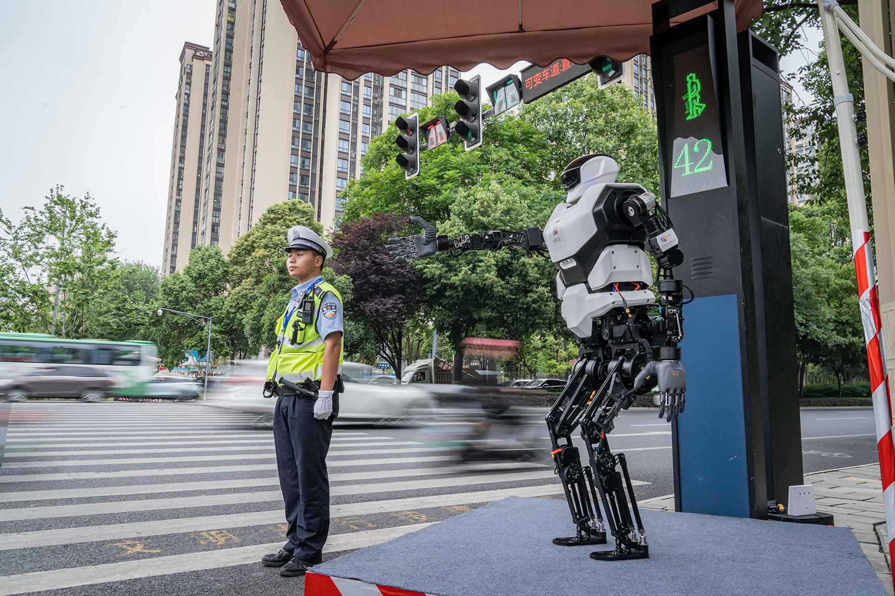 圖為5月11日,“綿陽造”人形機(jī)器人在四川省綿陽市科技城新區(qū)九洲大道與園藝街交叉路口,作為文明交通勸導(dǎo)“志愿者”配合民警開展工作。