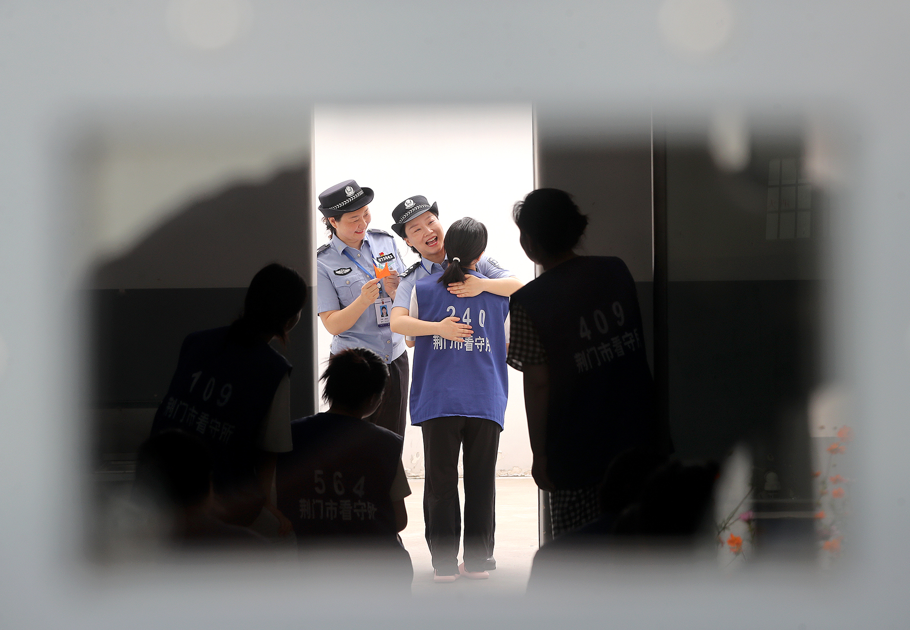 6月20日,在湖北省荊門市看守所女子監(jiān)區(qū)305監(jiān)室,管教民警將寫(xiě)滿祝福和期望的“千紙鶴”送給在押人員小芬,并送上一個(gè)擁抱,祝福小芬35歲生日。
