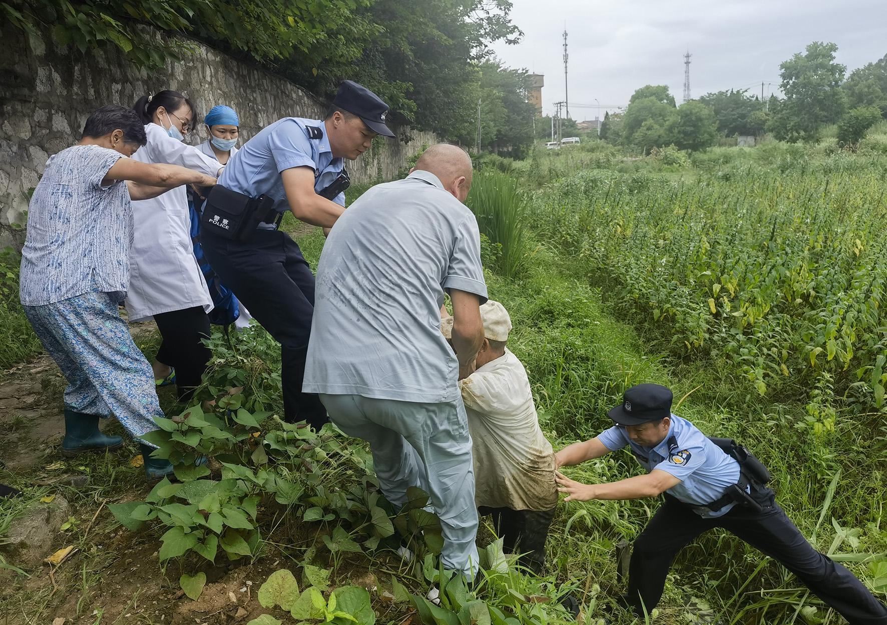 7月27日,安徽省巢湖市公安局半湯派出所接警稱,一位老大爺因不慎滑倒在水溝里,動彈不得。民警第一時間趕到現(xiàn)場,與醫(yī)護人員、熱心村民一起將老人救出水溝送醫(yī)。