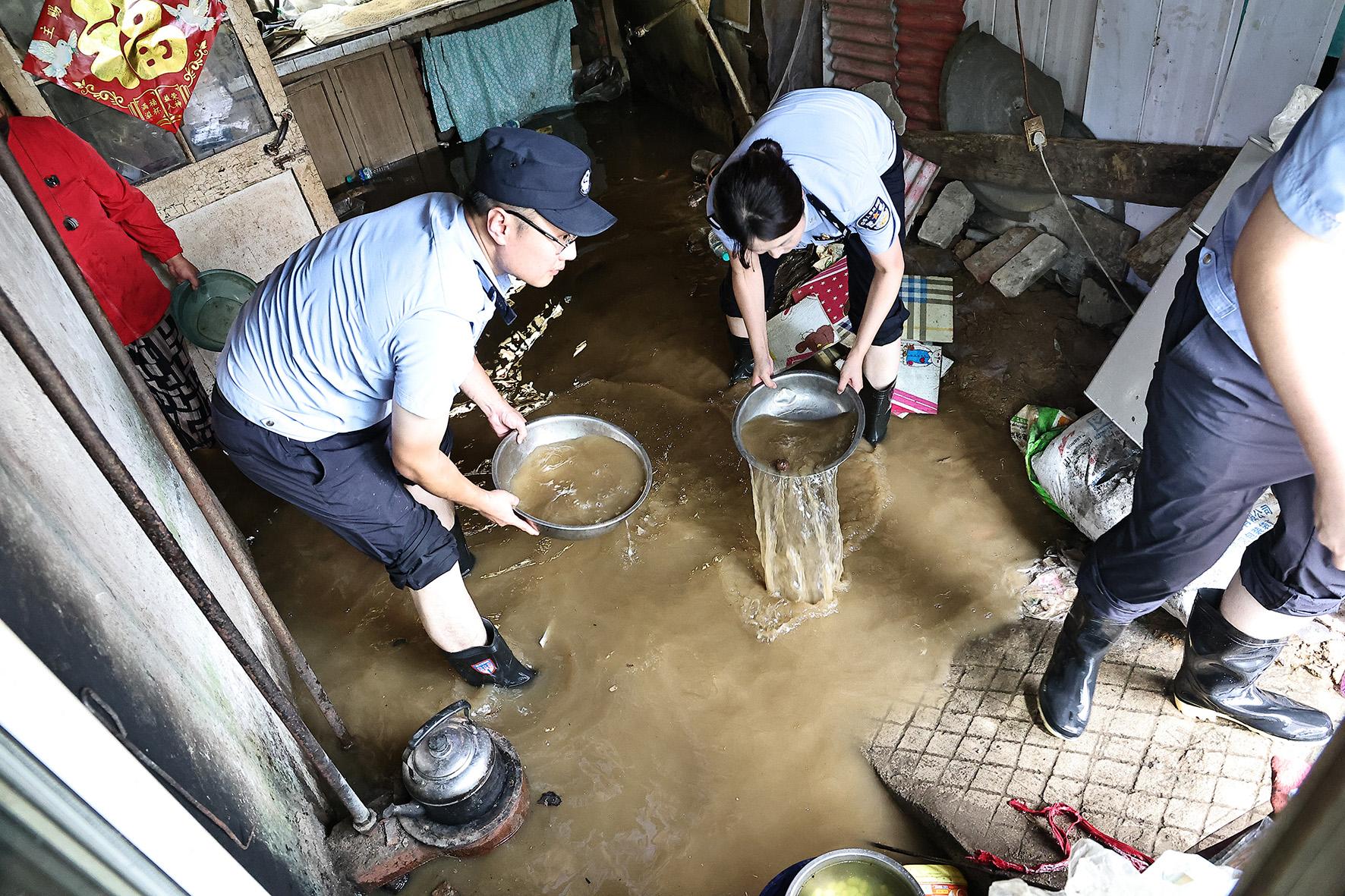圖為8月21日,大民屯派出所民輔警幫助轄區(qū)受災戶疏排房屋積水。