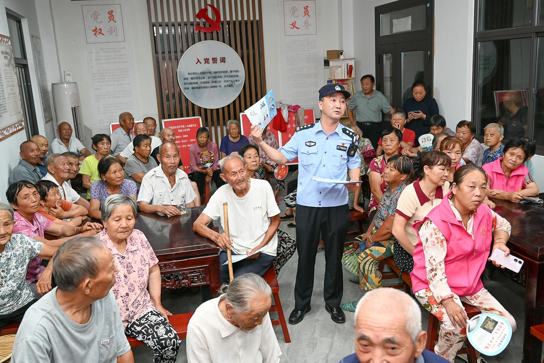 9月19日晚,安徽省和縣公安局石楊派出所民警在石楊鎮(zhèn)大武村老年學校,向老年學員們開展預防網(wǎng)絡詐騙法治宣講。
